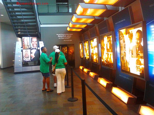 The ride up the escalator is pretty neat in that it adds to ones anticipation as to what they will see and do once at the top. The first thing I noticed was loud music coming from the room to the left of the escalator. I thought that there was some type of day party going on but later learned that it was the exhibit’s intro. To the left and at the top of the escalator is a long glass exhibit along the wall that measures about 30 feet or so in length and about four feet tall. Displayed on that wall are busts, silhouettes, and full length figures of African-Americans, Afro Americans, Blacks, Negroes, and Colored individuals and groups dating back to the 1400’s.