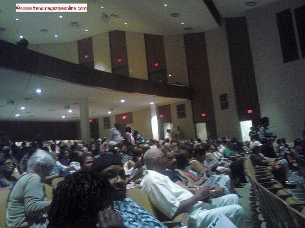 The fire continued with Marvin’s 1973 hit "Distant Lover" which was Thompson’s best performance thus far as he came into the audience and sang on his knees to two females and then slow-danced with another one. It was just another day at the office – if you were indeed Marvin Gaye! The temperature continued to heat up in a great scene – following Marvin’s death by his father -- that featured four tall streamers in the backdrop that played video containing chaos, war, starvation, conflict, riots, and was followed by a soul-stirring solo by his mother Alberta (U-Deen). Afterwards, the full cast was presented on stage wearing white for the final number before being introduced by Ms. Jackie Taylor after she addressed the audience. This play/musical ended at 10:30 PM.